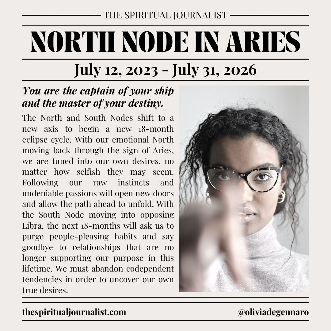 Promotional flyer for 'North Node in Aries' event by The Spiritual Journalist. Dates: July 12, 2023, to July 31, 2026. It includes a motivational message about self-discovery and personal growth. Features a photo of a person wearing glasses. Contact:
