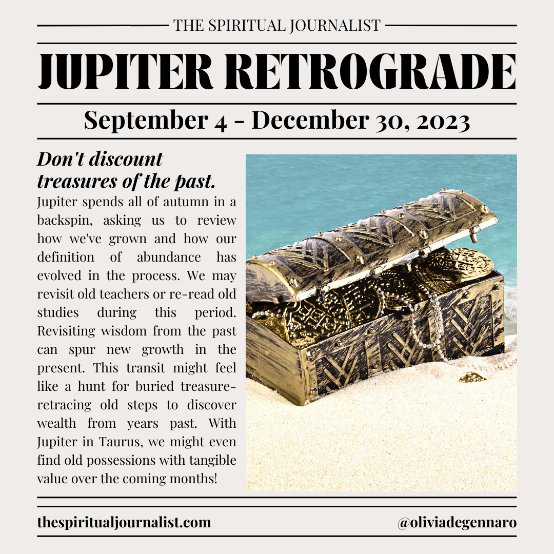 Flyer for "Jupiter Retrograde" from September 4 to December 30, 2023, by The Spiritual Journalist. It encourages reflecting on past growth and treasures, featuring an image of an open treasure chest on sand. Includes a website and social media handle