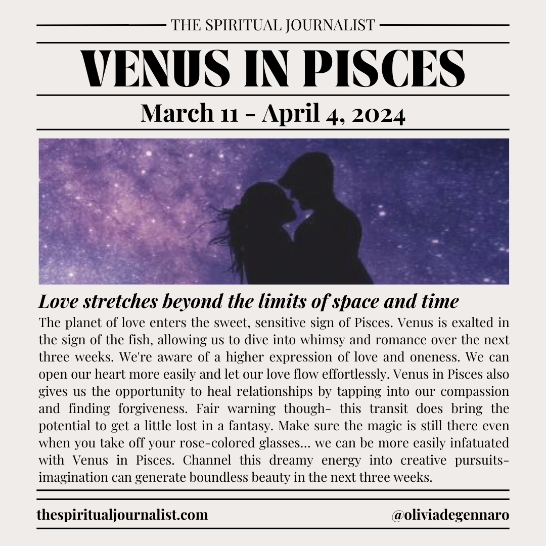 Promotional image for "Venus in Pisces" event from March 11 to April 4, 2024, by The Spiritual Journalist. Includes text describing the astrological influence and a silhouette of a couple against a starry sky. Website and social media handle included