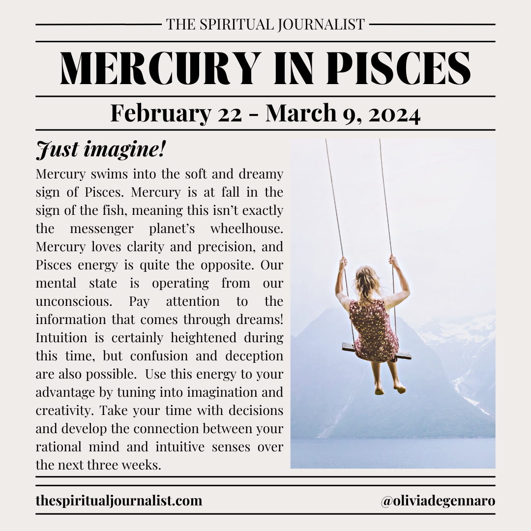Poster titled "Mercury in Pisces," dated February 22 - March 9, 2024, featuring a person on a swing overlooking a mountainous landscape. Includes text about Mercury's influence in Pisces, focusing on imagination, intuition, dreams, and creativity. Pr