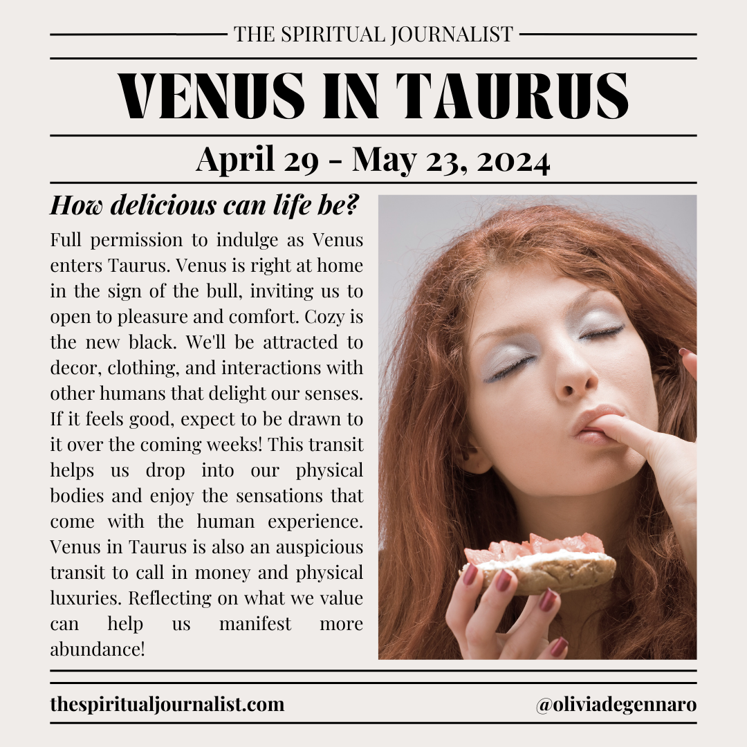 Promotional image for "Venus in Taurus" event from April 29 to May 23, 2024, by The Spiritual Journalist. Includes text about indulgence and pleasure, accompanied by a photo of a person enjoying food. Website: thespiritualjournalist.com. Instagram: @