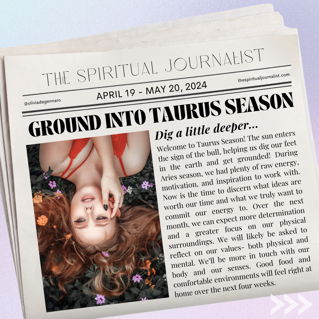 A digital newsletter titled 'The Spiritual Journalist' with the headline 'Ground Into Taurus Season.' The issue dates are April 19 - May 20, 2024. Below the headline is an article discussing Taurus season and its themes. An image of a woman lying on