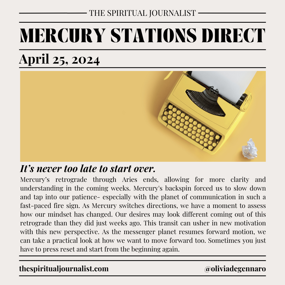 Yellow typewriter with paper on a light background, with text overlay discussing Mercury stationing direct on April 25, 2024. The text emphasizes new beginnings and reflection post-Mercury retrograde. Image includes branding for "The Spiritual Journa